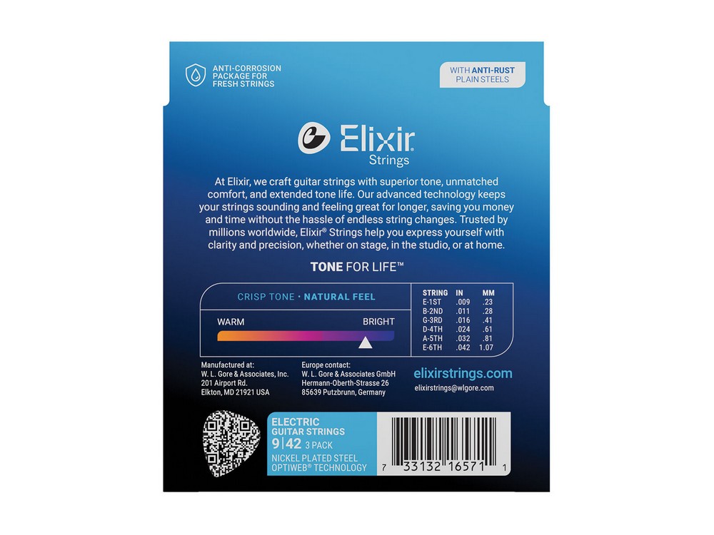 Elixir® Electric Nickel Plated Steel Strings with OPTIWEB® Coating give you the performance of a natural string — that crisp tone, natural feel and playable grip you know and love—without sacrificing the signature long-lasting tone life of Elixir Strings.