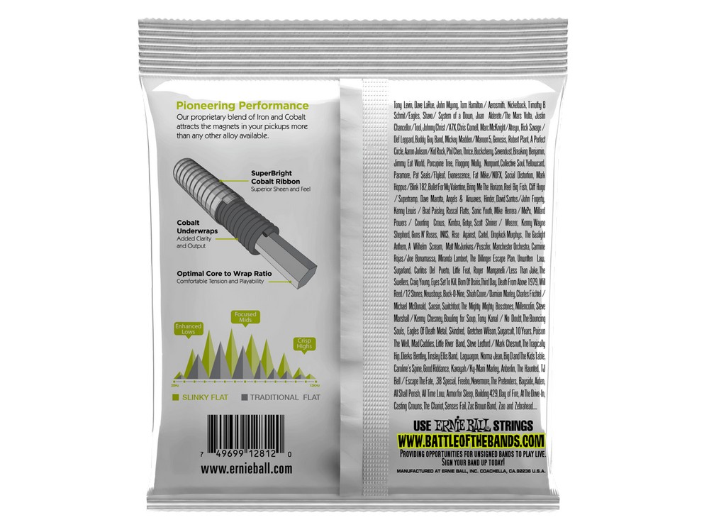 Ernie Ball Slinky Cobalt Flatwound Bass Strings combine the smooth feel of traditional flats and the power of Cobalt. Featuring a SuperBright Cobalt ribbon wrap, Cobalt underwraps and optimal hex-core to wrap ratio, the new Flatwound Bass strings are the first flat that actually feels like a flat and sounds like a round.
